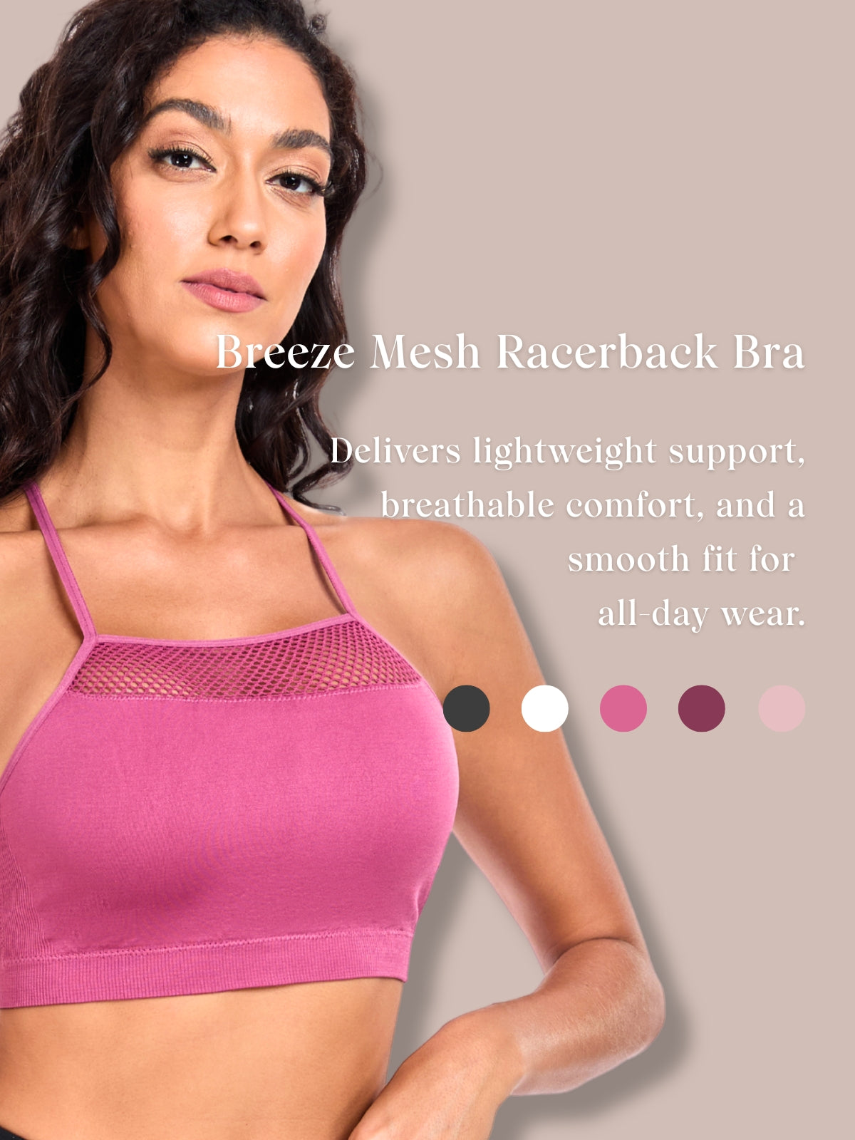 Effortlessly blending elegance and functionality, the Ethereal Breeze Mesh Racerback Bra is designed to keep you feeling confident and comfortable all day long. Featuring a delicate mesh panel for added breathability and a stylish touch, this bra offers lightweight support and a second-skin feel. The adjustable racerback straps ensure a perfect fit, while the seamless design provides a smooth silhouette under any outfit. Ideal for yoga, lounging, or casual outings, this bra combines beauty and practicality in every detail.
