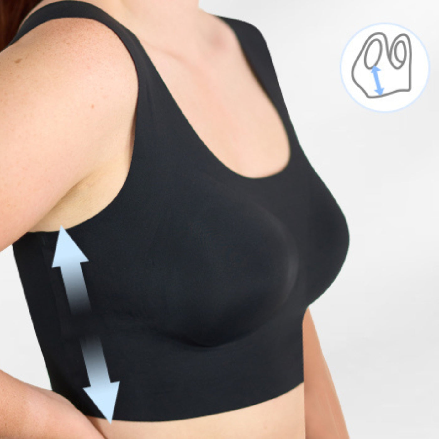 You asked, and we listened. Our upgraded invisible straps scoop wireless bra is back. Sleeker, stretchier material keeps you feeling lighter and cozier. Wider Straps and bands smooth out your chest and shoulders while providing the support you need. Larger removable sponge padding and wider pockets make it easier to insert breast forms and keep them securely in place. Available in more sizes and fits more shapes and sizes.