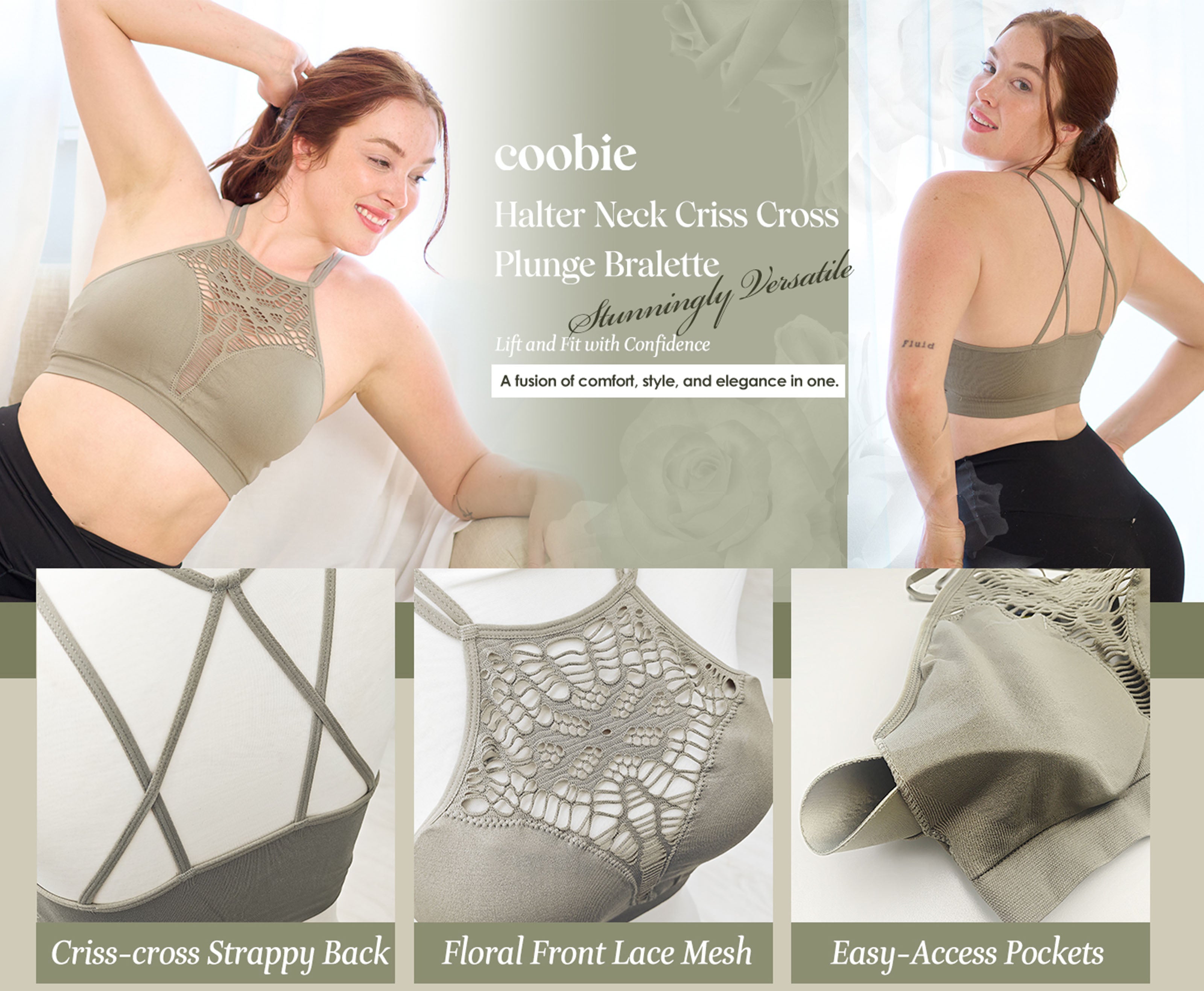 This Coobie Classic Floral criss cross bralette with a high neck and halter design makes you look more charming. Padded and lace mesh bra for maximum comfort and breathability. Easy to put on or take off and adjustable best fit size. Finished with removable cups for natural shaping, this seam-free bra will give you an instant confidence boost. A must-have for your essentials!